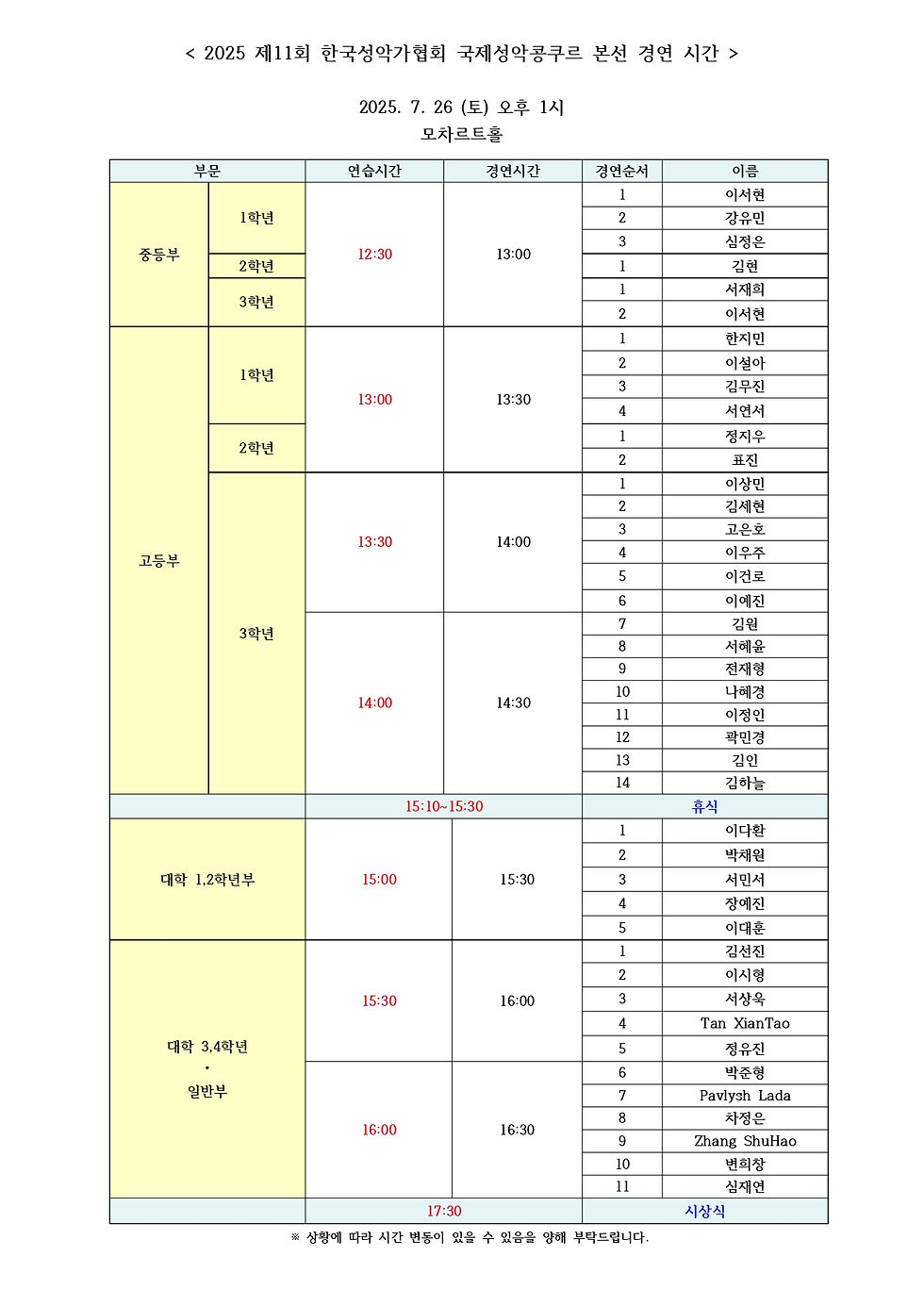 2025 제11회 한국성악가협회 국제 성악 콩쿠르 본선 경연 시간